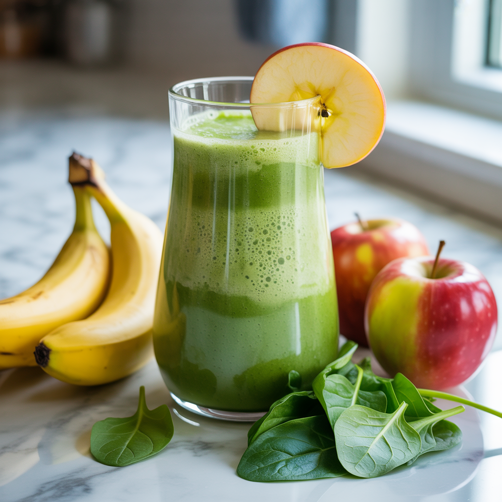- Zutaten: 2 Bananen, 2 Äpfel, 1 Handvoll Spinat, 200 ml Wasser oder Milch, optional 1 TL Zitronensaft.